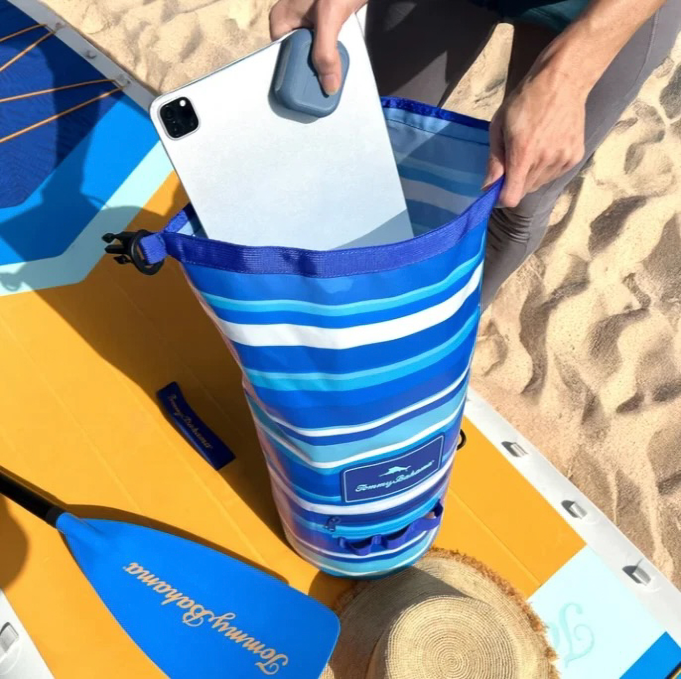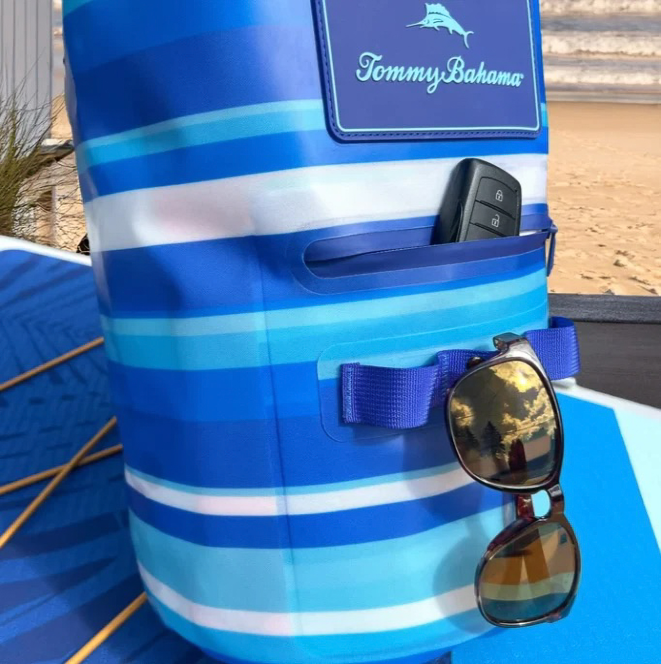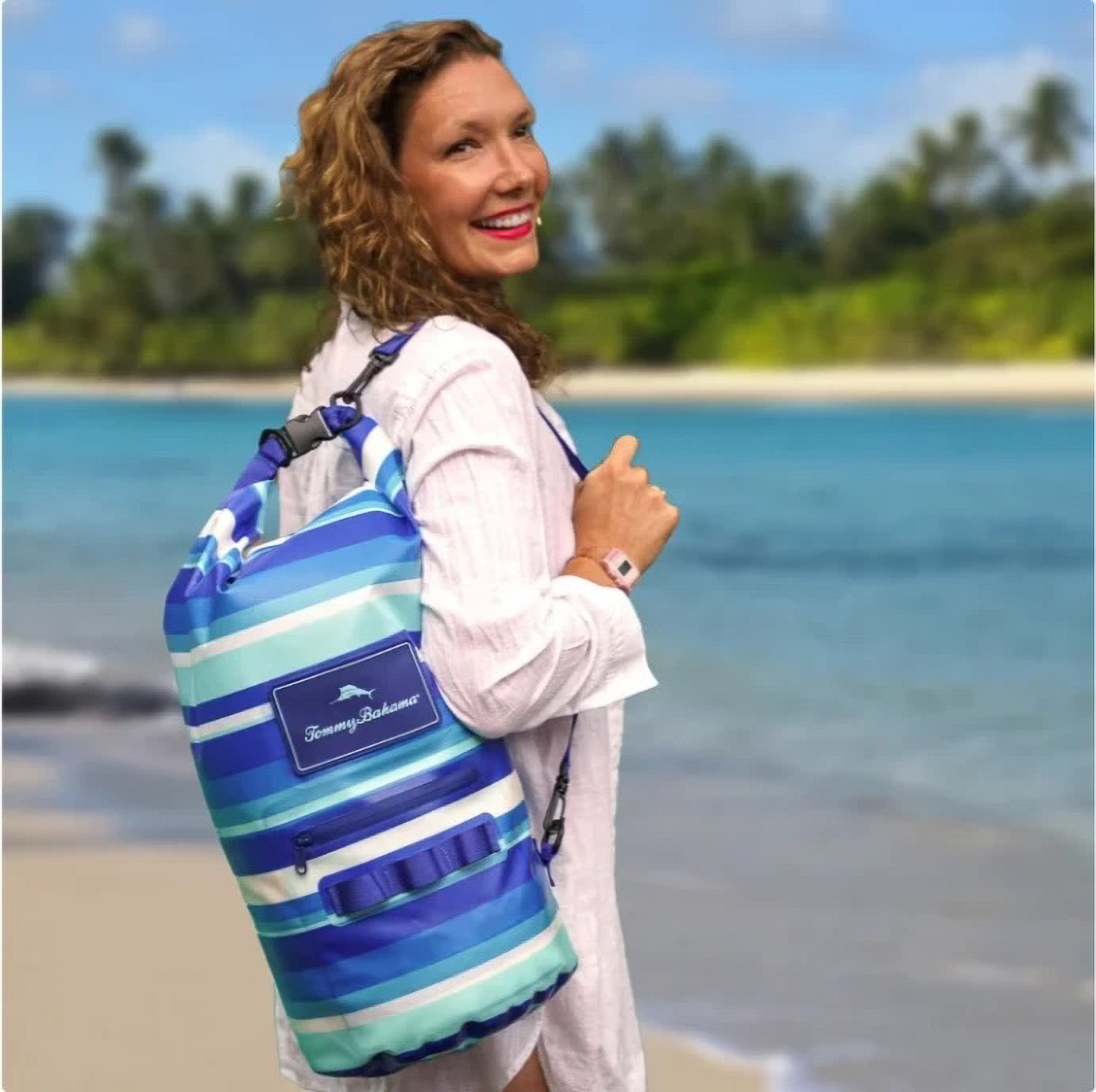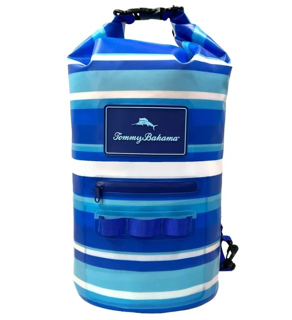 The Tommy Bahama® 20-Liter Waterproof Dry Bag is the perfect companion for boating, beach days, kayaking, and paddleboarding. Featuring iconic Tommy Bahama tropical patterns, this waterproof bag keeps your gear safe and dry with a roll-top closure rated IP66 to protect against splashes, rain, and brief submersion. The roomy 20L capacity fits towels, clothes, or gear, while a small water-resistant front pocket keeps essentials like keys or sunscreen within easy reach. An adjustable shoulder strap makes it comfortable to carry whether you’re on the boat, at the beach, or out exploring. Durable, lightweight, and stylish, this dry bag combines waterproof performance with the island vibe only Tommy Bahama® can deliver.